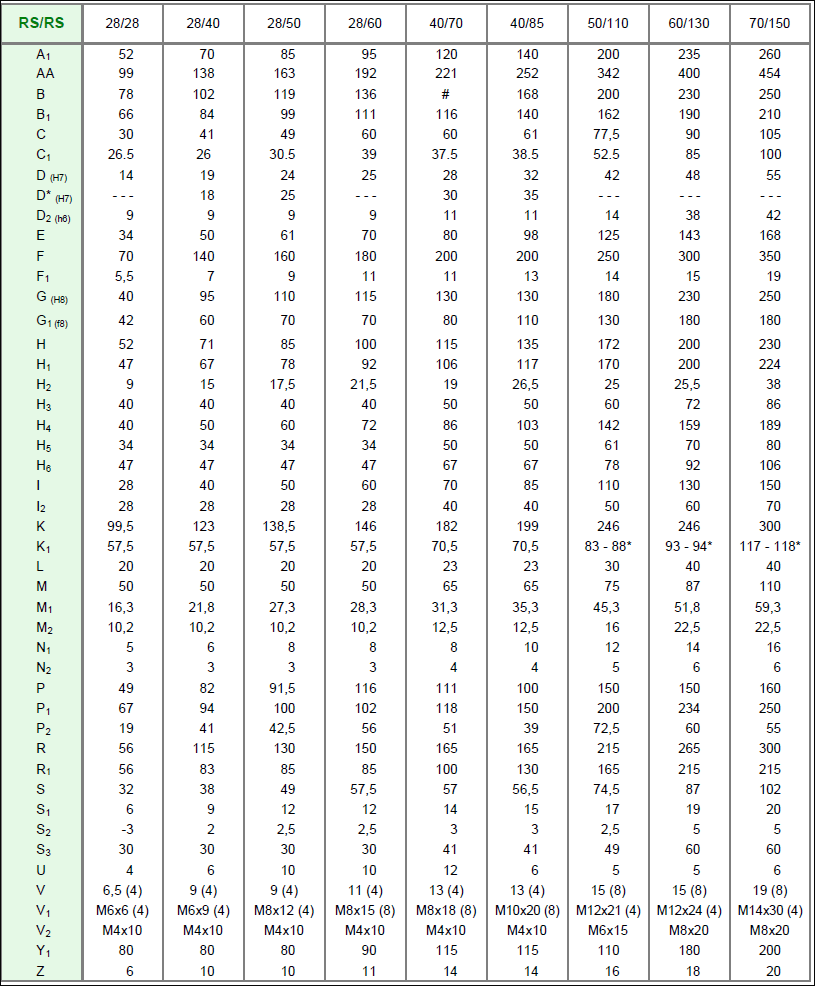 SRS28-RS28, SRS28-RS40, SRS28-RS50, SRS28-RS60, SRS40-RS70, SRS40-RS85, SRS50-RS110, SRS60-RS130, SRS70-RS150